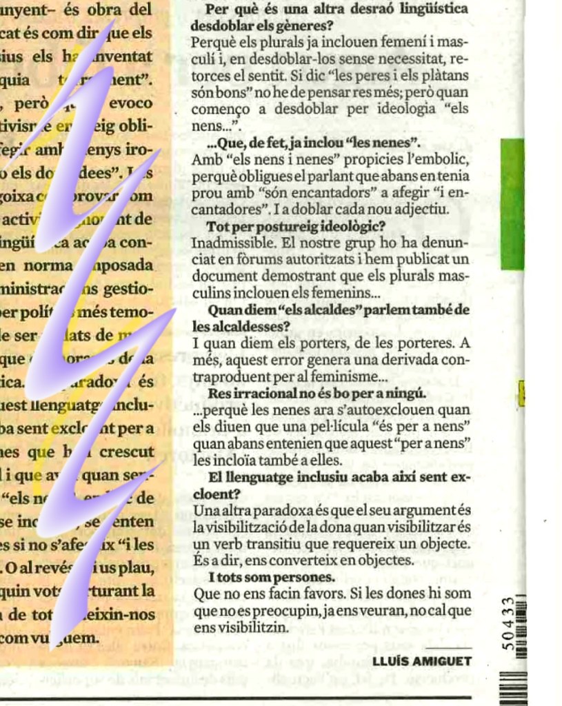 #1 Aquí la Contra a La Vanguardia de M. Carme Junyent, «Imponer el lenguaje inclusivo atenta contra la lógica lingüística», de la que he extret el fragment.